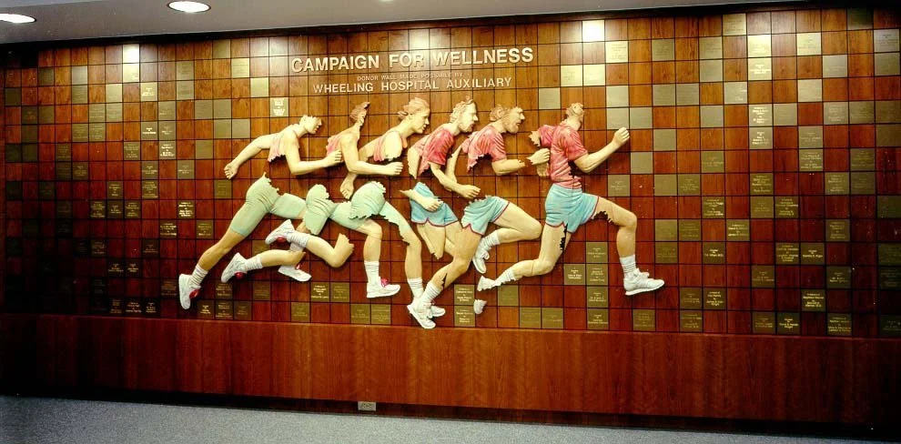 This donor recognition wall at Wheeling Hospital is an energetic homage to community support, featuring life-sized sculptures of runners in mid-stride, symbolizing the drive for health and wellness. Set against a backdrop of warm wooden panels, each brass plaque is an acknowledgment of a benefactor's contribution. The wall serves as an interactive narrative of support, with the "Campaign for Wellness" title and the hospital's auxiliary prominently displayed above, inviting viewers to engage with the story of communal effort and shared goals.