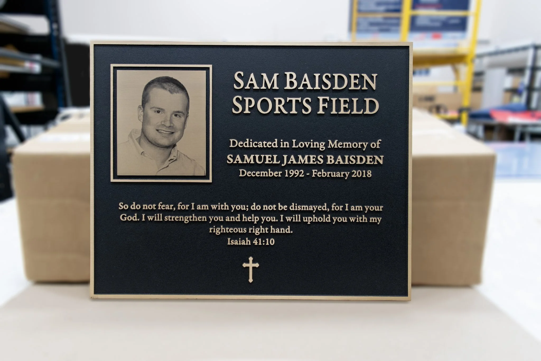 The construction of the plaque suggests a thoughtful approach to durability and presentation. The material selection, likely a high-grade metal such as bronze or brass, is chosen for its ability to withstand the elements if placed outdoors, and to maintain its distinguished appearance with minimal maintenance. The detailing, from the elegant script for the dedication to the precise embossing of the text and the cross, reflects a high level of craftsmanship. This is a plaque designed not just to mark a memory in time, but to celebrate a life with a physical elegance that resonates with the emotional weight of its message.