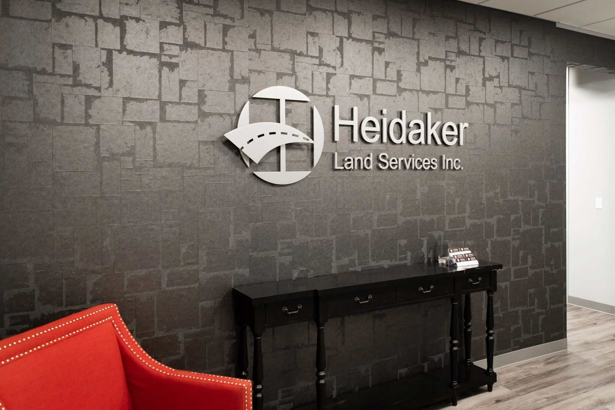 The Heidaker Land Services Inc sign in this image features sleek metallic letters against a rugged stone-like wall. The brushed finish of the metal provides a sophisticated contrast with the textured greys of the backdrop. The company logo, resembling a stylized bridge, adds a distinctive architectural touch. The scene is complemented by a bold red bench and an elegant black console table, combining style and function in the lobby's design.