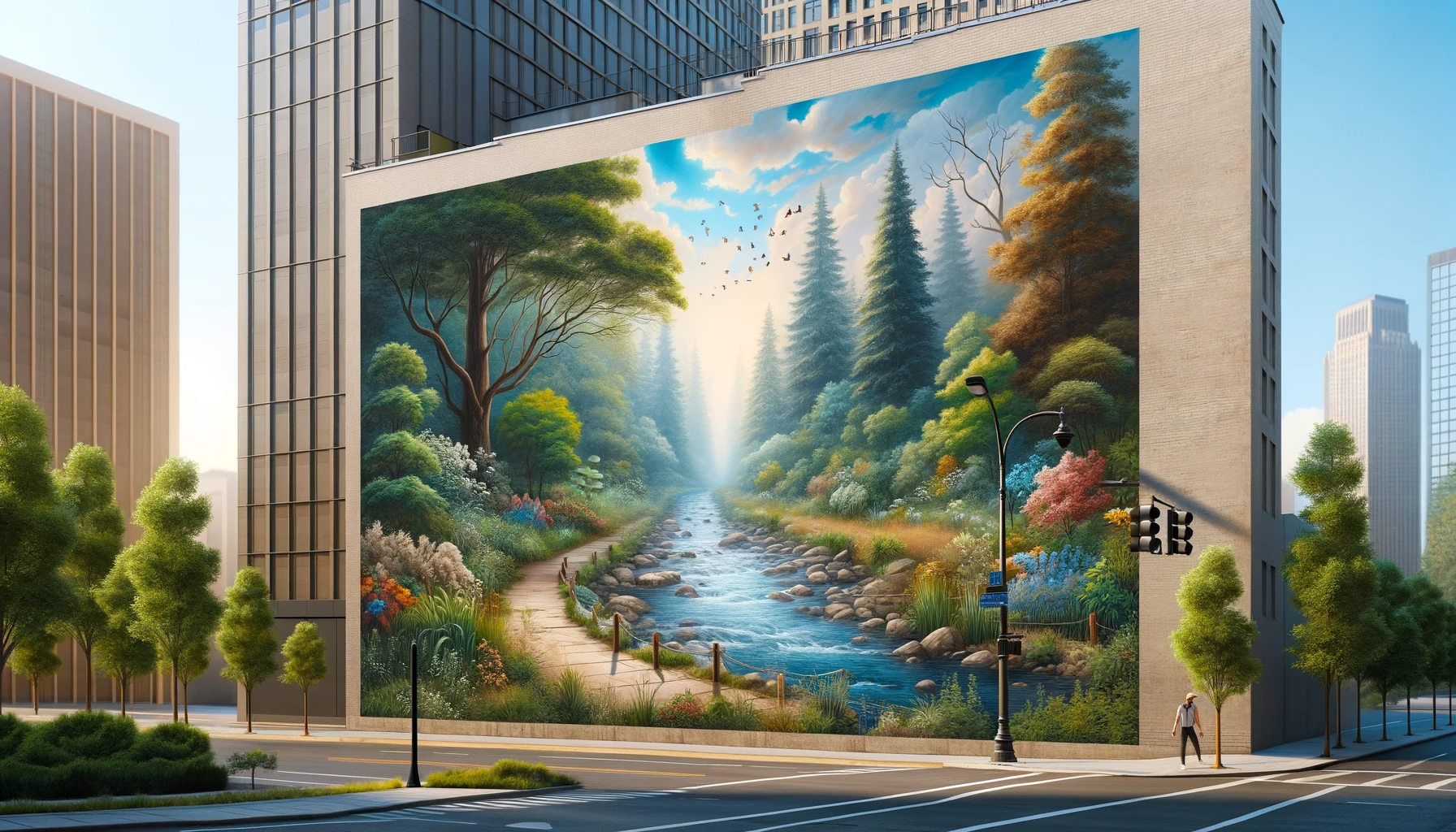 This tranquil nature-themed mural, set in an urban environment, is more than just a visual delight; it's a catalyst for positive social change. Studies suggest that such public art can lower crime rates, possibly due to the "broken window theory," which argues that well-maintained and beautified spaces deter vandalism and crime. Beyond enhancing the cityscape, the mural offers mental health benefits, acting as an urban oasis in the concrete jungle and providing a psychological escape that reduces stress. Furthermore, it fosters community engagement and pride, often becoming a cherished landmark that strengthens local identity. Its seamless blend of nature and urban elements also subtly encourages environmental awareness, making it not just an aesthetic enhancement but a significant contributor to the overall health and cohesion of the community.