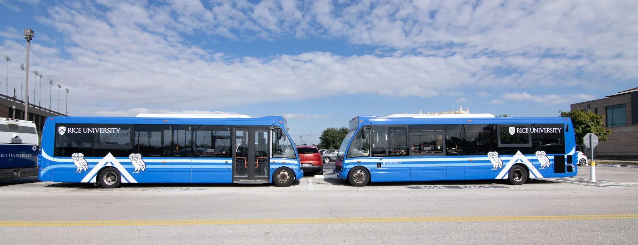 Capturing the essence of Rice University, a commercial bus dons a striking blue and white wrap, seamlessly integrating the school's logo and mascot. Parked under the expansive Texas sky, the vehicle serves as a dynamic ambassador for the university, its vivid colors echoing the institution's vibrant spirit. The wrap's design is both an advertisement and a moving tribute to Rice's community, with the iconic owl emblem standing out as a proud symbol of wisdom and knowledge. The bus is poised for its next journey, ready to navigate the bustling streets while showcasing the university's identity.