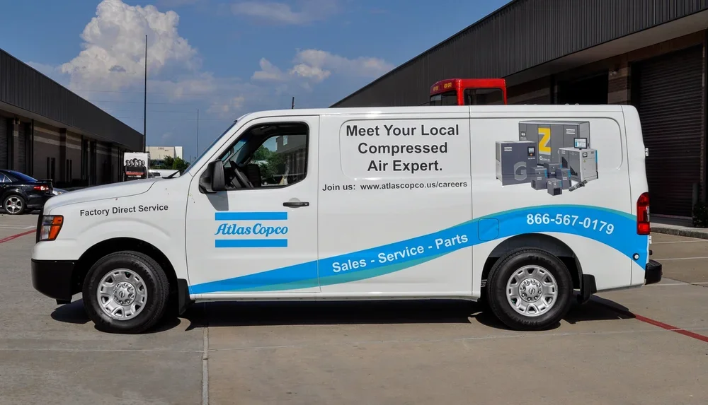 A white service van is parked in front of a commercial building on a sunny day. The van is branded with Atlas Copco's logo and contact information. The side of the van displays the text: “Meet Your Local Compressed Air Expert,” along with a website link (www.atlascopco.us/careers), a phone number (866-567-0179), and a list of services: Sales, Service, and Parts. There is also an image of industrial air compressor equipment. The van features blue and turquoise design elements and has “Factory Direct Service” written near the front wheel well.
